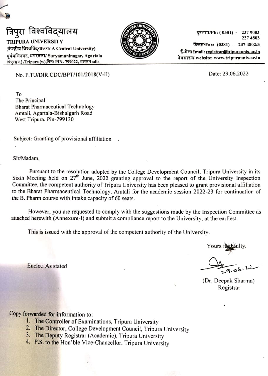 | 10 | Affiliation Letter | Tripura Board of Pharmacy Education Affiliation 2022-23 | 11-Nov-2022 | |
