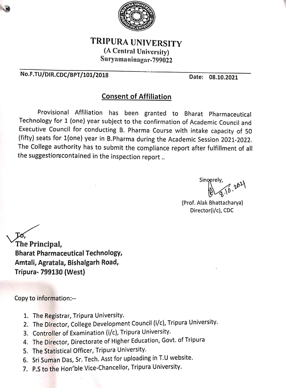| 14 | Affiliation Letter | Tripura Board of Pharmacy Education Affiliation 2020-21 | 19-Dec-2020 | |