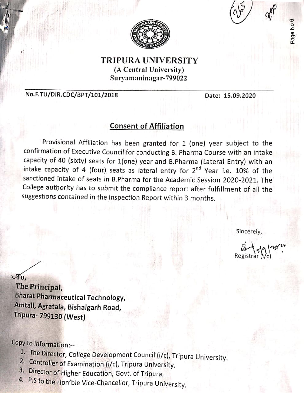 | 15 | Affiliation Letter | Tripura University Affiliation 2020-21 | 15-Sep-2020 | JPEG |