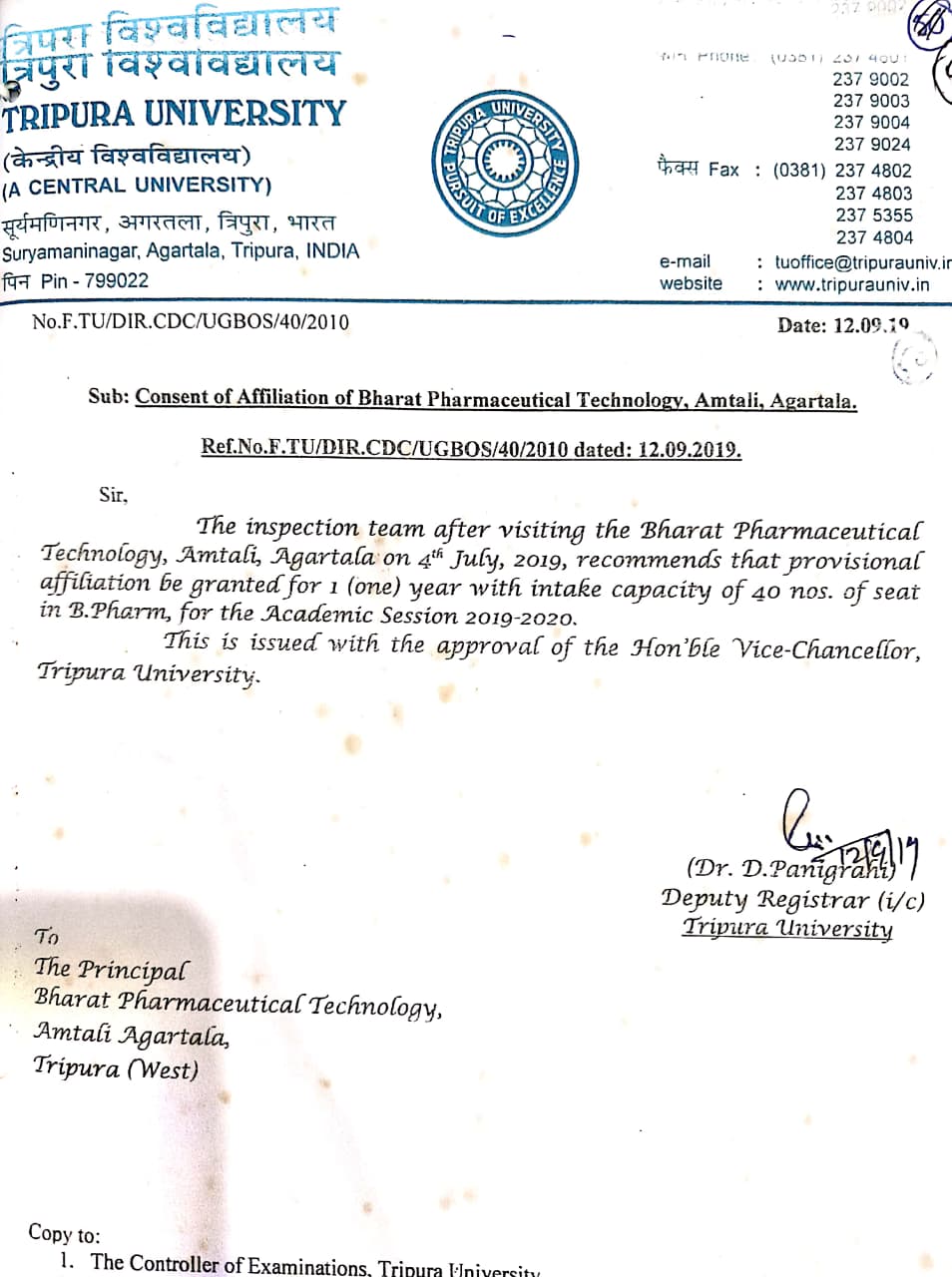| 17 | Affiliation Letter | Tripura University Affiliation 2019-20 | 12-Sep-2019 | JPEG |